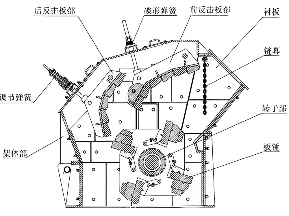 Когда материалы отправляются в камеру дробления, первое, что их встречает, — это первичная стадия ударного дробления. На этой стадии высокоскоростные молоты роторной плиты действуют как сильные удары молота, нанося первоначальный удар по материалам. Эта сильная ударная сила заставляет часть материала непосредственно разбиваться на более мелкие частицы. Конструкция и оптимизация роторных молотов гарантируют, что ударная сила максимальна, а потери энергии снижены.