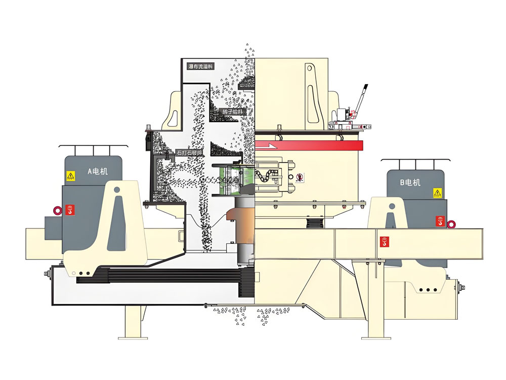 Когда ударная дробилка CV229 VSI получает команду запуска, вся установка начинает переходить в рабочее состояние. Во-первых, включается источник питания, и двигатель начинает работать и постепенно ускоряет свое вращение. Этот процесс не является простым прямым запуском, а включает в себя сложную систему трансмиссии. В частности, двигатель соединен с ротором через треугольный ремень, и когда двигатель вращается, он заставляет ротор вращаться вместе через треугольный ремень. Этот процесс занимает некоторое время, чтобы достичь устойчивого состояния работы, поэтому обычно есть фаза прогрева и ускорения, которая может длиться 10 минут или более, чтобы гарантировать, что ротор сможет достичь требуемой рабочей скорости.