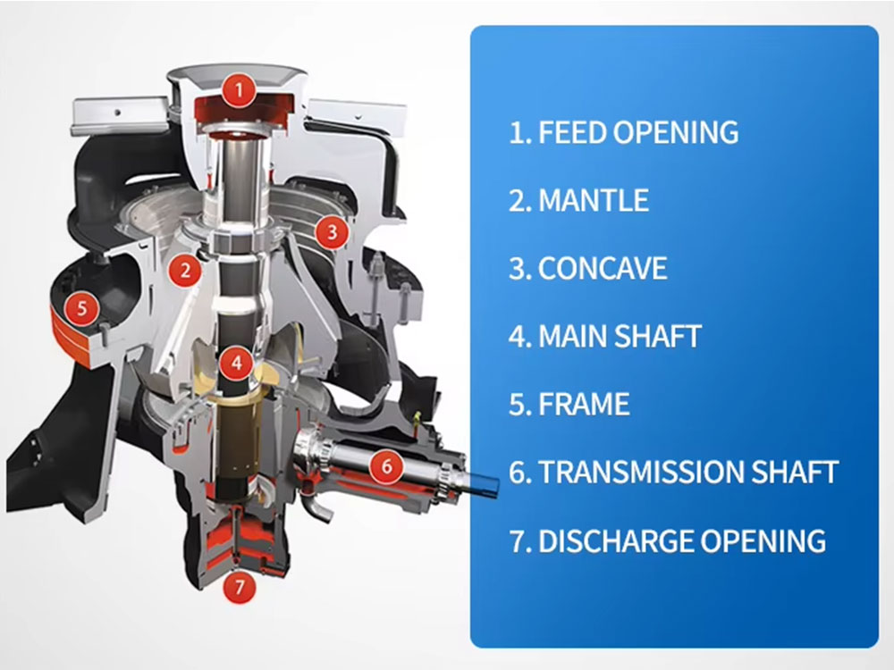 В этом процессе материалы в дробильной камере подвергаются не только экструзии между движущимся конусом и неподвижным конусом, но и воздействию, создаваемому вращением движущегося конуса, а также трению и сдвигу между материалами. Эти объединенные силы постепенно измельчают материал до требуемого размера частиц.