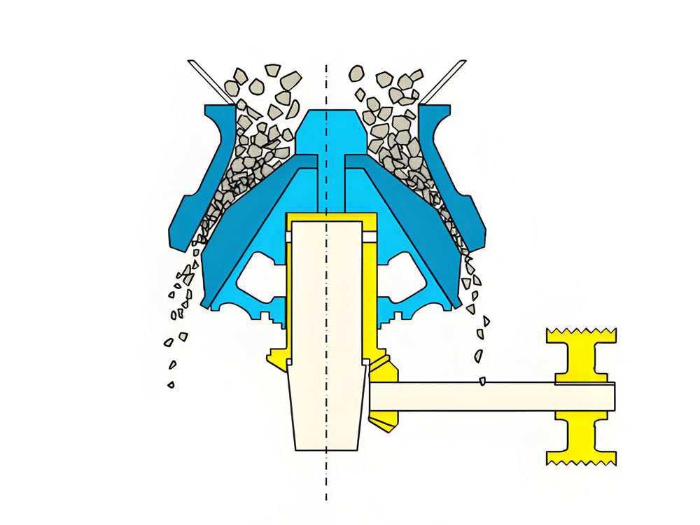 Она использует высокоточную коническую дробильную камеру, которая образует прогрессивную зону дробления между подвижным конусом и неподвижным конусом. Конус приводится в движение эксцентриковой втулкой для вращения и колебания, а материал грубо дробится путем сжатия, раскалывания и изгиба. Дробильная камера имеет встроенные износостойкие футеровки, самозатягивающаяся конструкция подвижной стенки предотвращает ослабление футеровок и продлевает срок службы, а цельный сферический верхний подшипник рычага заменяет традиционную футеровку, что повышает износостойкость в 5 раз и обеспечивает постоянный эксцентриситет. Приводимая в действие электродвигателем, мощность передается на эксцентриковую втулку через редуктор и вал трансмиссии, заставляя динамический конус вращаться по определенной траектории. Скорость вращения конуса соответствует эксцентриковому расстоянию для достижения непрерывного дробления. Материал поступает в камеру дробления через верхнее входное отверстие, и когда движущийся конус периодически приближается к неподвижному конусу, он генерирует высокоинтенсивную экструзию и измельчает материал; когда движущийся конус находится далеко от неподвижного конуса, измельченный материал падает вниз и выгружается снизу под действием силы тяжести. С помощью гидравлической системы для регулировки высоты неподвижного конуса или положения конуса, для изменения выходного зазора камеры дробления, для управления диапазоном размеров готового продукта. Благодаря глубокой интеграции механической конструкции и интеллектуального управления это оборудование решает болевые точки традиционной конусной дробилки с точки зрения эффективности, стабильности и стоимости обслуживания и подходит для крупномасштабных сценариев грубого дробления руды.